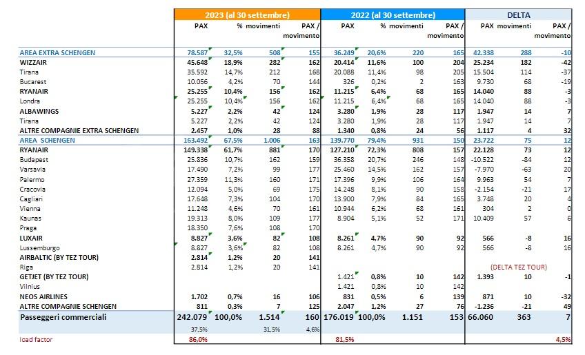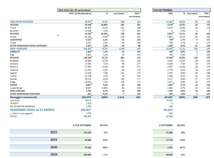 246.630 di cui 1762 di aviazione generale. Il tasso di riempimento (LF: load factor) complessivo da inizio anno è pari al 86%: sui voli di linea il picco si ha con Kaunas (Lituania) con circa 354 passeggeri a volo e un LF del 93,7% da inizio Summer Season, seguono Varsavia e Cracovia rispettivamente con LF del 92,4% e del 91,2%. Sui voli charter la rotta per Riga con Airbaltic registra nei mesi di luglio, agosto e settembre un LF del 94,8% con 20 voli. L’incremento dei passeggeri commerciali registrato nei primi 9 mesi del 2023 rispetto allo stesso periodo del 2022 è di +37,5% mentre i movimenti sullo scalo nello stesso periodo crescono del 31,5% con un incremento del LF del 4,5%.