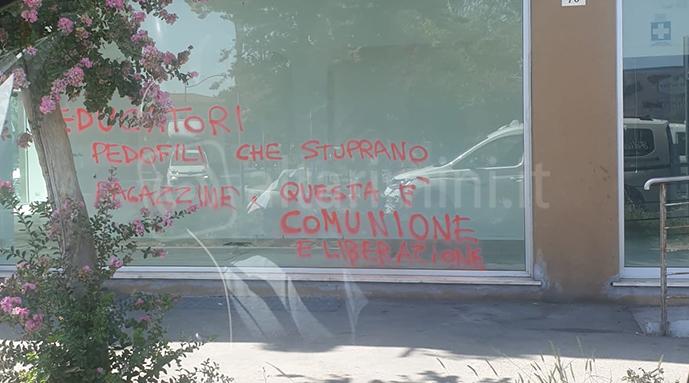 Tra gli slogan impressi con la vernice spray sulla vetrata vi erano messaggi come “Via il Meeting da Rimini, Mattarella complice” e “Educatori pedofili che stuprano ragazzine, questa è Comunione e Liberazione”. Le frasi erano chiaramente provocatorie e accusatorie.