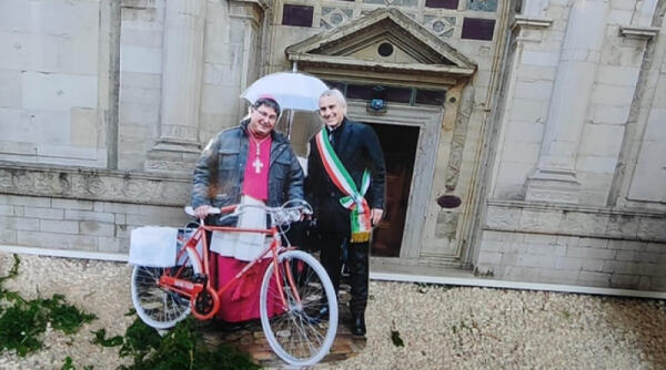 Sindaco di Rimini e vescovo in bicicletta: sorpresa nel presepe