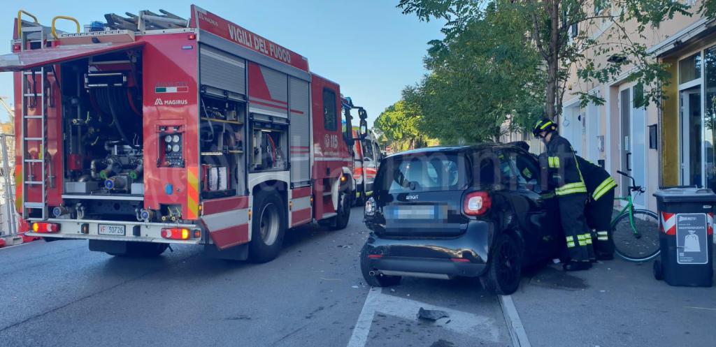 Una giovane donna alla guida di un’automobile, sembra a causa di una distrazione, ha causato una serie di collisioni. Inizialmente, l’auto ha colpito una Smart parcheggiata, proiettandola contro un albero. Successivamente, l’auto della donna ha terminato la sua corsa sul marciapiede, abbattendo la segnaletica stradale e una bicicletta parcheggiata.