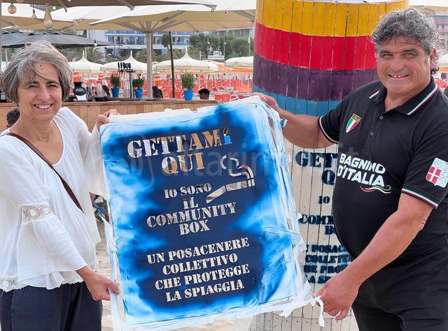 Sulla battigia, accanto al frequentatissimo chiringuito del bagno Tiki 26 di Gabriele e Fabrizio – nella foto da destra a sinistra insieme all’assessora all’Ambiente Anna Montini e Valentina Ridolfi del Piano Strategico, con Manuela Fabbri, presidente dell’associazione Basta Plastica in Mare Network – mercoledì sera (28 giugno) si è riposizionato per la seconda estate, l’utilissimo community box. Si tratta di un posacenere collettivo a mo’ di sigaretta, costruito e installato sulla battigia dove un’ordinanza comunale vieta di fumare per proteggere mare e spiaggia, ma che raramente viene rispettata.