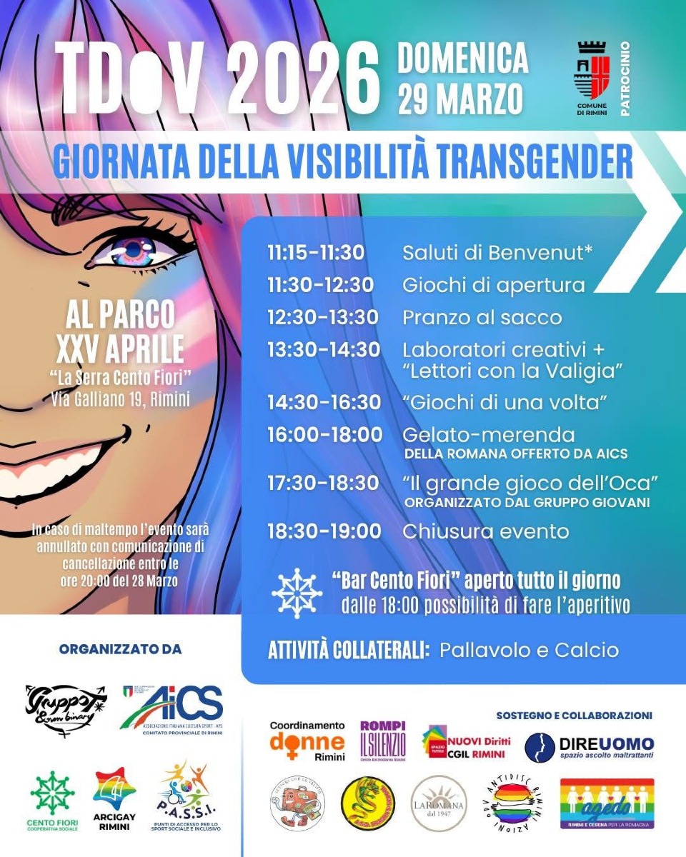 Domenica 29 marzo, il Parco XXV Aprile – Serra Cento Fiori di Rimini ospiterà la terza edizione di “Ci vediamo al Parco!”, iniziativa aperta alla cittadinanza organizzata da AICS Comitato Provinciale Rimini APS in collaborazione con Arcigay Rimini “Alan Turing” e con il Patrocinio del Comune di Rimini, in occasione della Giornata Internazionale della Visibilità Transgender (TDoV).