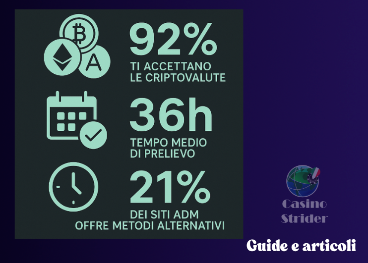 Secondo i nostri test, il 92% dei casinò stranieri accetta pagamenti in criptovalute, mentre solo il 21% dei siti ADM propone metodi alternativi ai bonifici o carte. Inoltre, il tempo medio di prelievo registrato è inferiore a 36 ore nel 74% dei casi testati — un risultato eccellente in termini di efficienza e affidabilità.