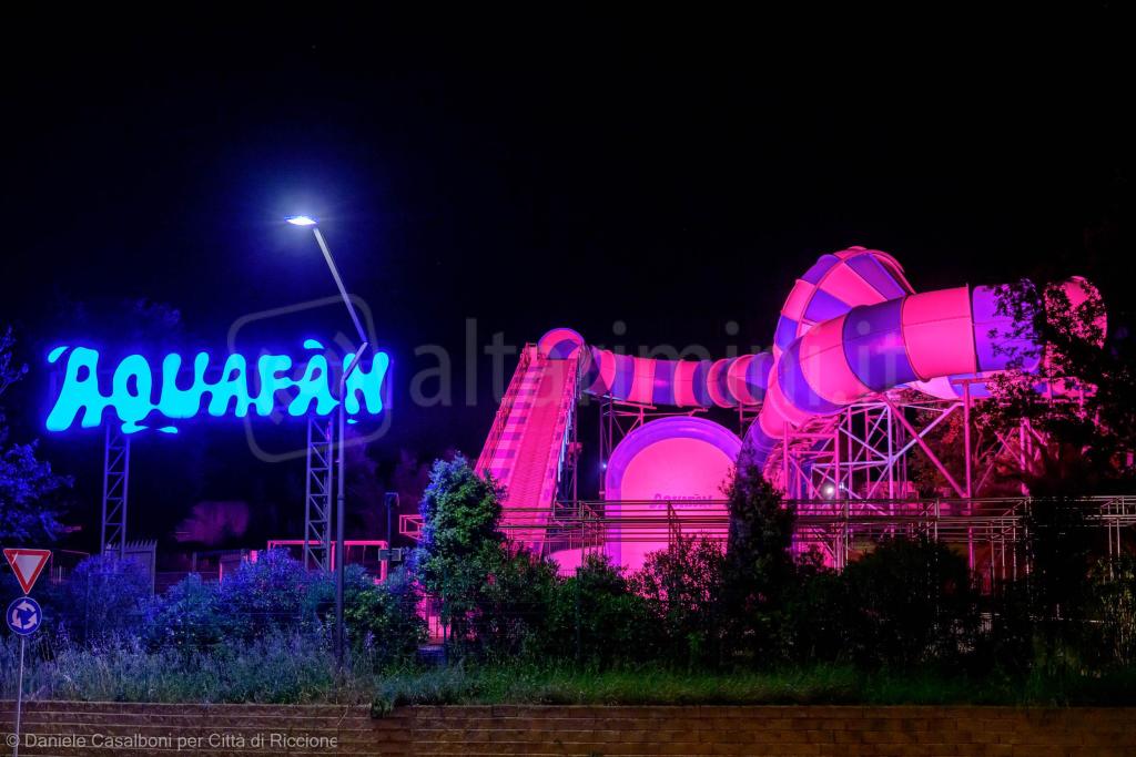 Dalle 20 fino alle 3 del mattino il centro si è illuminato con le sfumature rosa di viale Ceccarini, della fontana del Bosco della pioggia, dei giochi d’acqua che da piazzale Roma accompagnano la passeggiata fino al porto, cui si sono aggiunte le facciate delle ville in stile liberty – Villa Mussolini, Villa Lodi Fè, Villa Franceschi – il Palazzo del Turismo e il Palazzo dei Congressi, e nella zona più a nord la suggestiva fontana del lungomare Goethe. Anche le strade si sono illuminate di rosa, nelle rotonde in prossimità di viale Da Verrazzano e sulla Statale Adriatica in prossimità dell’ospedale (viale Frosinone) e di viale Formia.