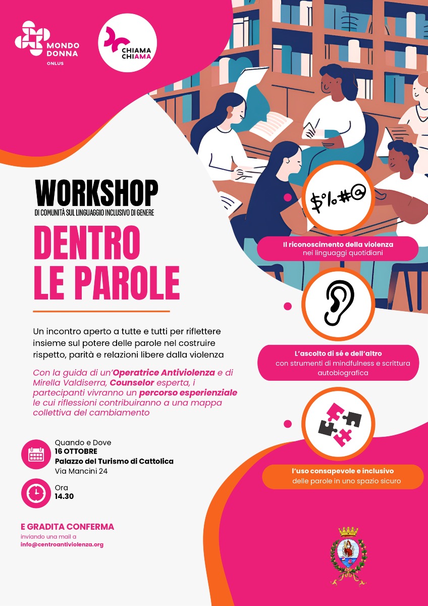 Le parole giuste per costruire una cultura del rispetto contro la violenza di genere. “Dentro le parole” è il workshop gratuito e aperto a tutta la cittadinanza che si terrà giovedì 16 ottobre, a Palazzo del Turismo, dalle ore 14.30 alle 16.30. Obiettivo dell’incontro, organizzato dalla Onlus Mondo Donna, dal Centro antiviolenza distretto di Riccione ChiamaChiAma con il patrocinio del Comune di Cattolica, è di riflettere su come riconoscere la violenza nel linguaggio e promuovere un uso consapevole e inclusivo delle parole. Con la guida di un’operatrice antiviolenza e della counselor Mirella Valdiserra, i partecipanti potranno vivere un percorso esperienziale le cui riflessioni contribuiranno a una mappa collettiva del cambiamento.