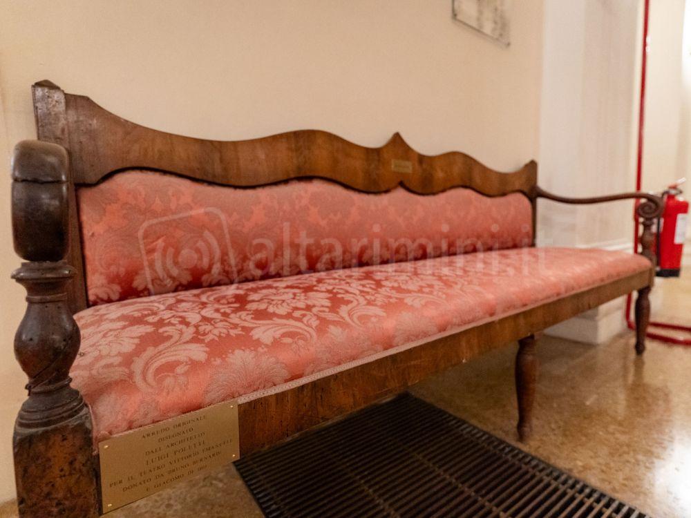 Quattro di quei divani, parte dell’arredo dell’allora Teatro Nuovo oggi Teatro Galli, tornano nel foyer polettiano, grazie alla passione e alla generosità dell’antiquario riminese Bruno Bernardi e di Giacomo Di Dio.