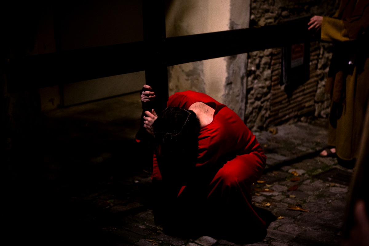 Il corteo, dopo aver fatto un lungo e suggestivo percorso attraverso il centro storico e la piazza, arriva al monastero delle Monache Agostiniane di Sant’Antonio da Padova e sosta brevemente dentro la piccola chiesa. Le alture della Rupe, ai piedi dell’antico monastero agostiniano, richiamano il Golgota, in un contesto naturale fortemente solenne e suggestivo, illuminato solo da torce e falò. Qui viene rappresentata la Rievocazione della Passione e Morte di Gesù a cura della Filodrammatica Pennese.