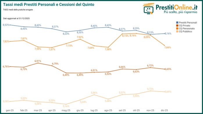 Il 2025 si chiude con un segnale positivo per il mercato dei finanziamenti: secondo l’Osservatorio di Segugio.it i tassi dei prestiti personali sono scesi dall’8,35% di gennaio all’8,16% di dicembre, mentre le cessioni del quinto per dipendenti privati e pensionati hanno registrato ulteriori ribassi. Una dinamica che ha favorito anche l’Emilia-Romagna, dove aumentano importi medi richiesti e durata dei finanziamenti.