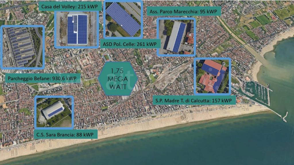 Nello specifico si tratta di sei impianti fotovoltaici per la produzione di energia da fonte rinnovabile a servizio dei cittadini che sono da collocare sui tetti dell’associazione Parco Marecchia in via de Warthema, sulla copertura della palestra “Casa del Volley” in Via Bidente, dello stabile della Polisportiva Celle in Viale Euterpe, del Centro Sportivo “Sara Brancia” in Via Aleardo Aleardi e sulla copertura della Scuola Primaria “Madre Teresa di Calcutta” in Via Sforza.