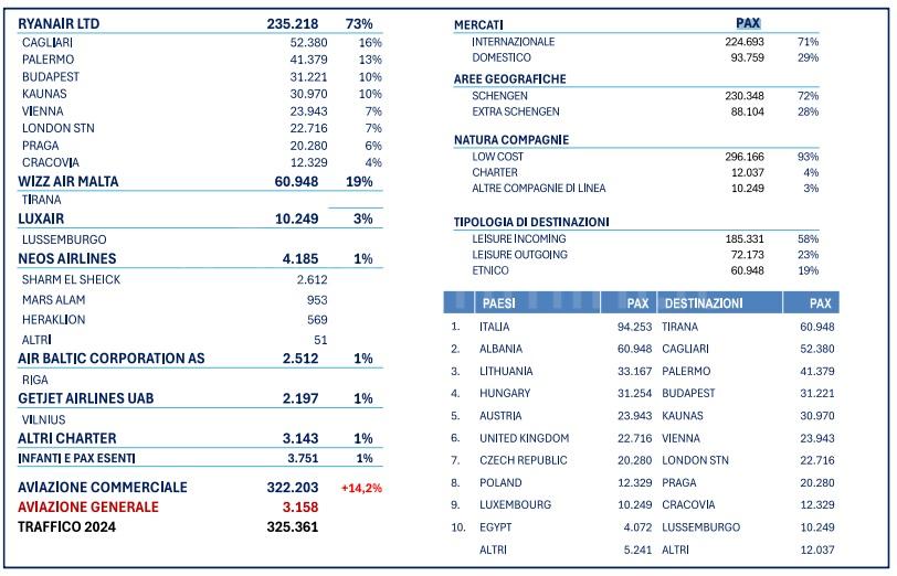 Il traffico commerciale del 2024 è stato prevalentemente internazionale (71%), leisure incoming (58%) e operato da compagnie low cost (93%), con Ryanair che si conferma la compagnia principale (73%).