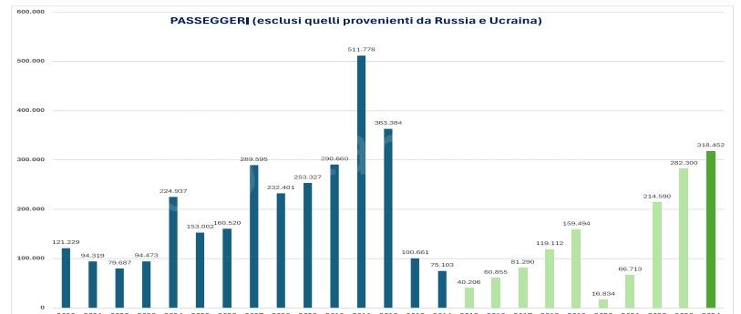 Il segmento di mercato che attualmente caratterizza il portafoglio del Fellini (quello senza i passeggeri della Federazione russa e Ucraina) cresce dal 2015 con un tasso medio ponderato annuo (CAGR) di +30%, raggiungendo nel 2024 la terza posizione della storia dell’aeroporto. Sotto si rappresenta l’andamento degli ultimi 25 anni, dal 2000 al 2024.