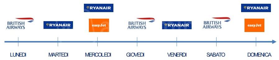 L’apertura del mercato del Regno Unito: in summer 2025 si potrà volare da e verso i tre principali aeroporti londinesi Heathrow (British Airways), Gatwick (EasyJet) e Stansted (Ryanair) ogni giorno della settimana e, addirittura, il mercoledì e la domenica con due voli, come sotto riportato.