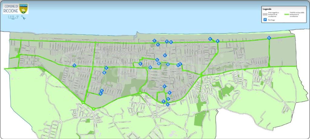L’area del centro abitato del Comune di Riccione soggetta al divieto di circolazione comprende la zona urbana a mare della Statale 16. Sono esenti dalle limitazioni la Statale 16 stessa e alcuni tratti della viabilità urbana al confine, tra cui viale Torino dal confine con Misano Adriatico, viale Felice Pullè e viale Gabriele d’Annunzio dal confine con Rimini. Inoltre, per consentire l’accesso ai principali parcheggi e alla struttura ospedaliera, sono esclusi i seguenti tratti: viale Vercelli, viale Aosta, viale Luigi Angeloni, viale Portofino, viale Castrocaro, viale Vittorio Emanuele II, viale Luigi Einaudi, viale Ceccarini (nella porzione compresa tra viale Vittorio Emanuele II e viale delle Magnolie), viale delle Magnolie, viale XIX Ottobre (nel tratto tra viale Panoramica e viale Diaz), viale Panoramica (nella sezione tra viale XIX Ottobre e viale Santorre di Santarosa), viale Santorre di Santarosa (nella parte tra viale Panoramica e via Adriatica), viale Giovanni da Verrazzano, viale Milano, viale Frosinone, viale Formia, viale Cervi (nel tratto compreso tra viale Frosinone e viale Formia), viale Ruffini (nel segmento tra viale Cervi e piazza Unità), viale Lazio (nel tratto compreso tra viale Formia e l’accesso al parcheggio della biblioteca), viale Bonderno, viale Cortemaggiore (nella porzione tra viale Bonderno e viale Lungorio), viale Lungorio, viale dei Mille (nel tratto compreso tra viale Lungorio e viale Parini), e viale Catullo (nel tratto compreso tra viale Parini e l’accesso al parcheggio del Palacongressi).