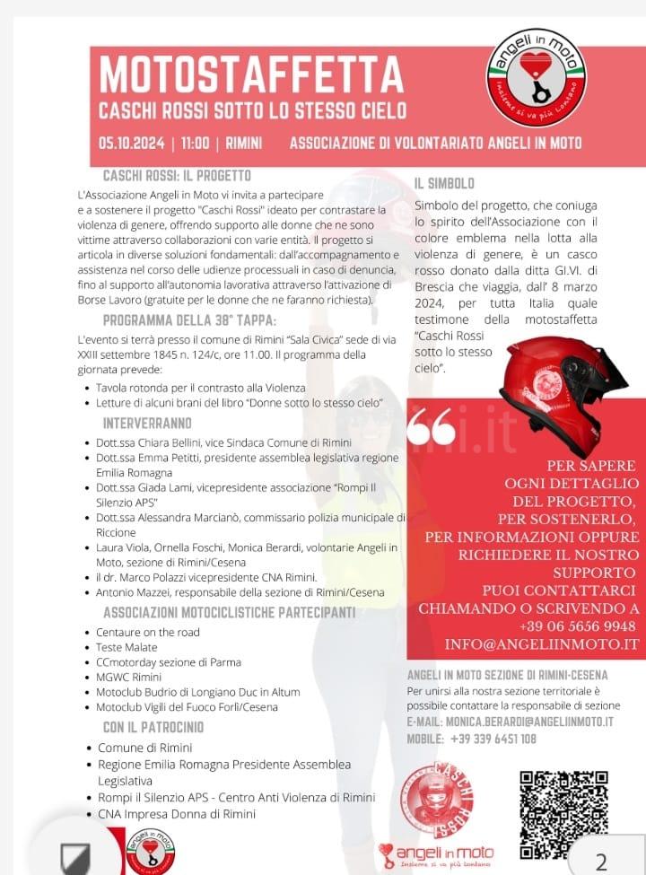 L’Associazione di volontariato Angeli in moto, attiva dal 2015 con diversi progetti di inclusione sociale, è diffusa sul territorio con circa 750 iscritti in tutta Italia, ha deciso di strutturare una campagna di sensibilizzazione per contrastare la violenza di genere attraverso la realizzazione del progetto “Caschi Rossi”. L’iniziativa è volta a supportare le donne vittime di violenza in collaborazione con la rete di associazioni del territorio, con le forze dell’ordine, i servizi sociali e i centri anti-violenza territoriali, attraverso un percorso di consapevolezza.