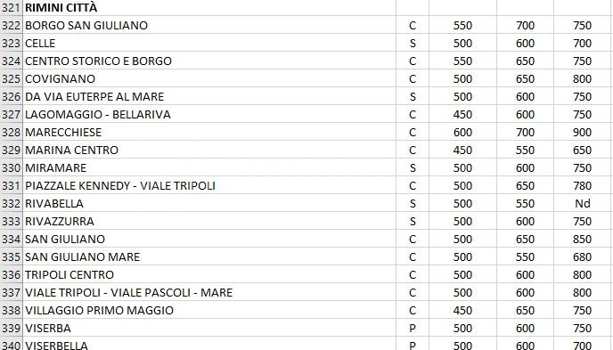 A Rimini città per un monolocale si va dai 450 euro di Villaggio Primo Maggio, Marina Centro e Lagomaggio Bellariva ai 600 euro per la zona Marecchiese. I bilocali viaggiano tra i 550 euro di Marina Centro, Rivabella e San Giuliano Mare fino ai 700 euro del Borgo San Giuliano e zona Marecchiese. Per un trilocale i prezzi vanno dai 650 di Marina Centro ai 900 della zona Marecchiese.