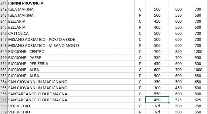 Per quanto riguarda la provincia per un bilocale si va dai 300 euro di San Giovanni in Marignano ai 700 di Riccione Centro. I bilocali vanno dai 450 di San Giovanni in Marignano ai 850 di Riccione Centro. Per i trilocali le cifre si alzano: dai 600 di Bellaria ai 1200 euro di Riccione Centro.