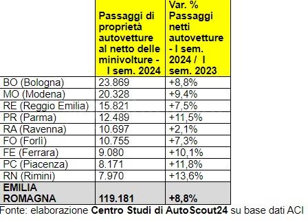 Nel I semestre 2024, secondo l’elaborazione di AutoScout24 su base dati ACI, la classifica delle province per numero di passaggi di proprietà netti vede in testa Bologna con 23.869 atti (+8,8% sul I sem. 2023), seguita da Modena con 20.328 (+9,4%), Reggio Emilia con 15.821 (+7,5%), Parma con 12.489 (+11,5%), Ravenna con 10.697 (+2,1%), Forlì con 10.755 (+7,3%), Ferrara con 9.080 (+10,1%), Piacenza con 8.171 (+11,8%), Rimini con 7.970 (+13,6%).