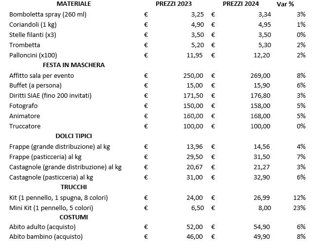 In questa occasione, Federconsumatori ha monitorato i prezzi dei prodotti alimentari, dei costumi e degli accessori tipici del carnevale, nonché i costi per organizzare una festa a tema con amici e parenti. Mediamente i prezzi aumentano del +5% rispetto al 2023, gli aumenti più elevati si registrano per i trucchi, per l’acquisto dei costumi e per i dolci tipici.