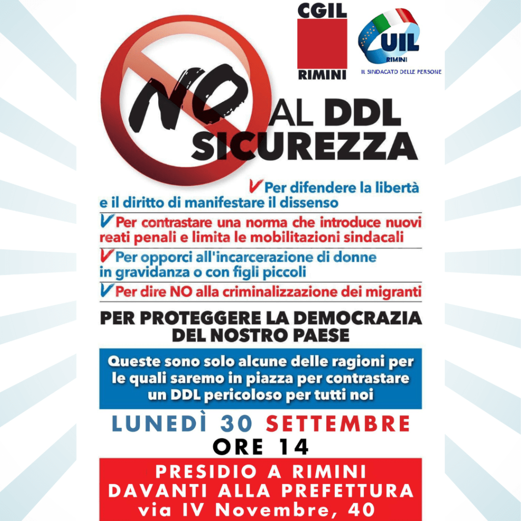 Lunedì 30 settembre alle ore 14 CGIL Rimini e UIL Rimini saranno davanti alla Prefettura di Rimini (via IV Novembre, 40) per protestare contro il “Ddl Sicurezza”