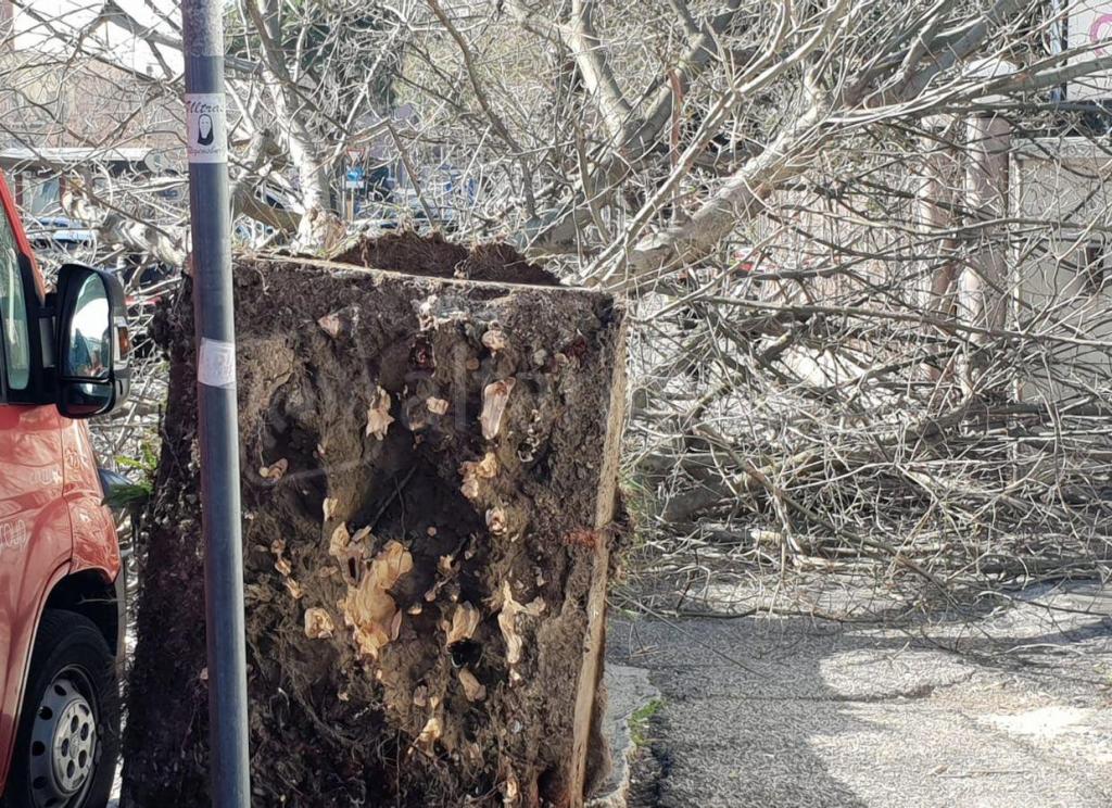 Enorme albero cade in un parcheggio a Rimini e sfiora furgone del corriere
