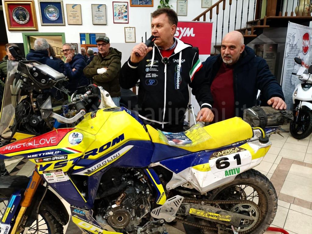 Ad applaudire e complimentarsi con i piloti, oltre alla famiglia Ugolini, erano presenti quasi tutti gli sponsor che hanno supportato i piloti ed il loro seguito in Africa ed amici e famigliari. Un ricco aperitivo a base di porchetta, spianata e salumi e tanto spumante offerto dalla Concessionaria Suzuki dei fratelli Ugolini ed infine un gigantesco panettone da 10 chili e ancora tappi di spumante che saltavano per festeggiare questa grande impresa.
