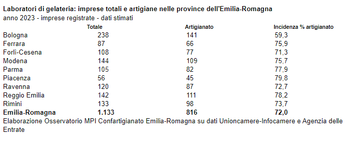 In chiave territoriale, tra le principali province emiliano-romagnole, si stima un numero di laboratori di gelateria pari a 238 unità a Bologna, pari a 144 unità a Modena e pari a 142 unità a Reggio Emilia.