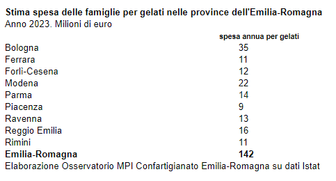 Per il 2023 in Emilia-Romagna la spesa delle famiglie per gelati è stimata intorno ai 142 milioni di euro