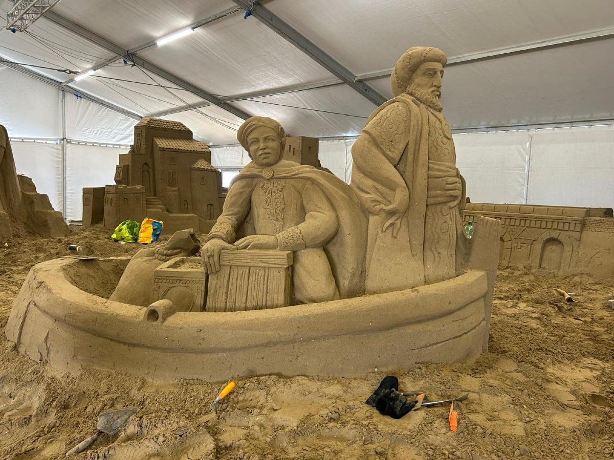 Gli artisti al lavoro sono otto, provenienti da Bulgaria, Spagna, Bielorussia, Russia e Italia, e il gruppo – composto da cinque donne e tre uomini – ha dato vita a un insieme di sculture che unisce tecnica, monumentalità e un forte impatto scenografico. Il percorso è pensato come un viaggio immersivo nella grandiosità del cinema epico, riletto attraverso la delicatezza della sabbia modellata.