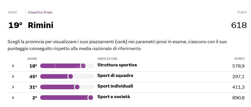 Anche quest’anno, il risultato della provincia di Rimini è molto positivo, confermandosi tra le top 20 nella classifica generale: il territorio riminese si posiziona infatti al 19esimo posto, sostanzialmente confermando la posizione dello scorso anno (17esimo). Un dato che conferma lo stretto e inscindibile legame della nostra provincia con il mondo dello sport, sia dal punto di vista agonistico che amatoriale che sociale e turistico.