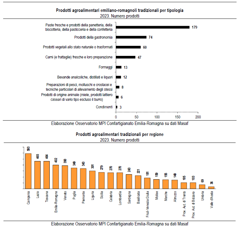 La tavola di Pasqua con i prodotti della tradizione – La biodiversità della produzione agroalimentare emiliano-romagnola, ad elevata vocazione artigianale, si declina in ben 402 prodotti agroalimentari tradizionali, caratterizzati da metodiche di lavorazione, conservazione e stagionatura consolidate nel tempo (Ministero dell’agricoltura, della sovranità alimentare e delle foreste, 2023). Per tipologia dei prodotti, primeggiano le paste fresche e prodotti della panetteria, della biscotteria, della pasticceria e della confetteria con 179 prodotti, pari al 44,5% del totale, seguiti da 74 Prodotti della gastronomia, pari al 18,4% del totale e da 60 Prodotti vegetali allo stato naturale o trasformati, pari al 14,9%: queste tre tipologie di prodotti concentrano ben il 77,9% del totale.