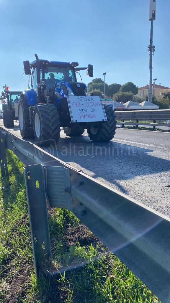 Trattori ancora in strada a Rimini questa mattina, martedì 13 febbraio, dopo la protesta di ieri. Il passaggio sulla Statale 16 della giornata di lunedì non aveva creato particolari problemi alla circolazione, di poco rallentata in più rispetto al solito traffico.