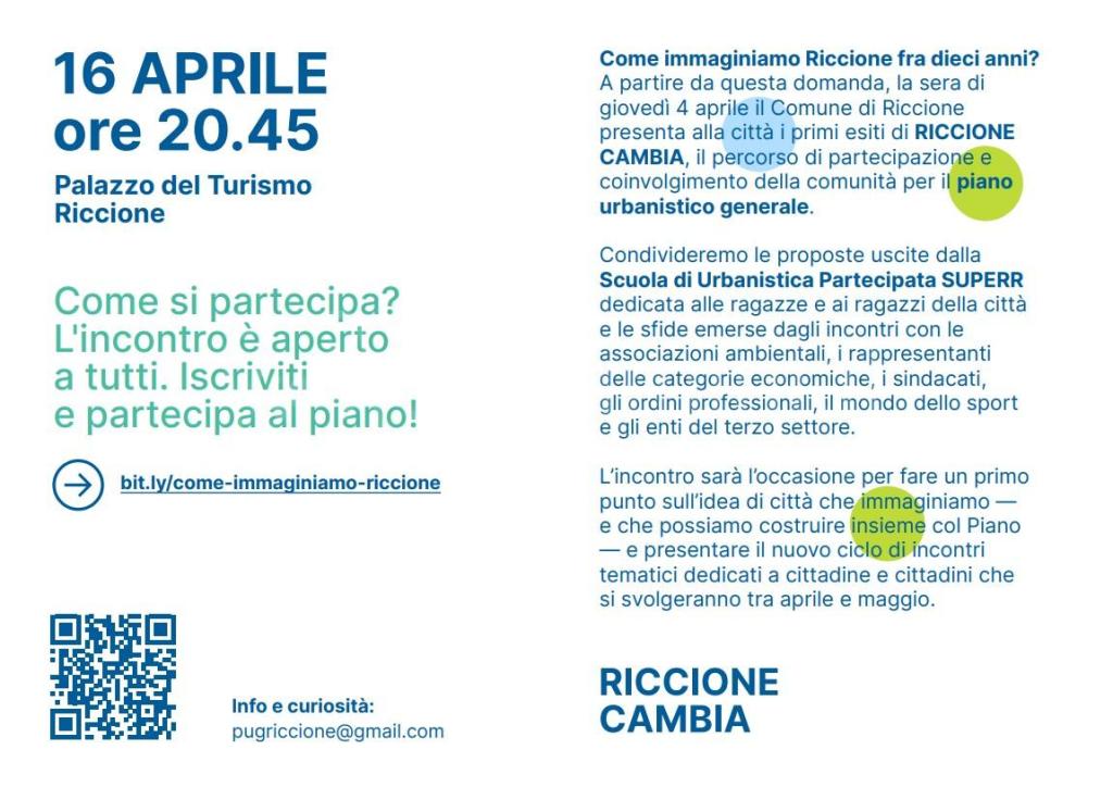 L’incontro del prossimo 16 aprile si terrà al Palazzo del Turismo, alle 20.45. Oltre alla sindaca e ai componenti della Giunta comunale, saranno presenti i rappresentanti dell’Ufficio di Piano e gli esperti che stanno accompagnando il Comune di Riccione nello sviluppo del Pug.