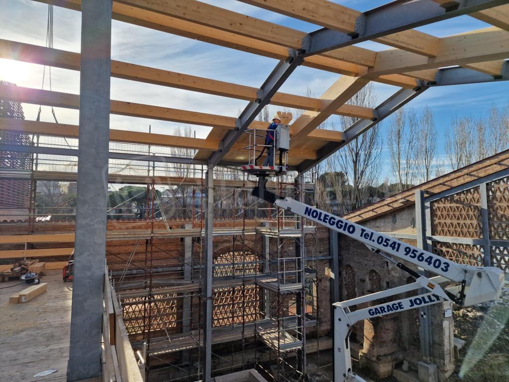 Riccione, montaggio del tetto dell'ex Fornace Piva