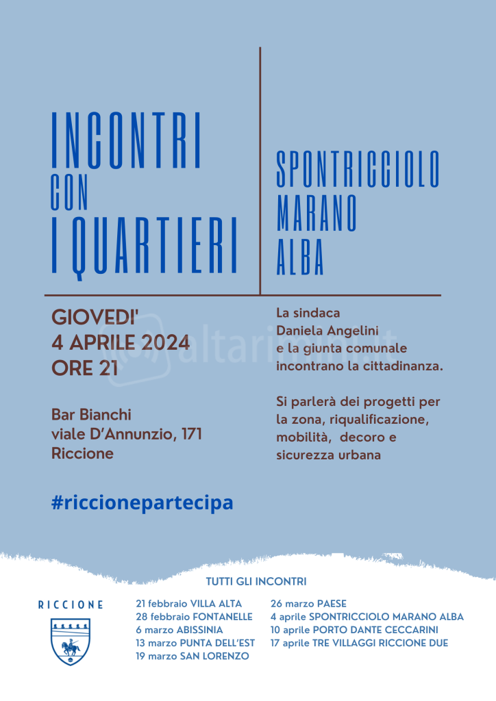 La sindaca Daniela Angelini e i componenti della giunta comunale di Riccione domani, giovedì 4 aprile, incontrano la cittadinanza alle 21 al bar Bianchi in viale D’Annunzio 171. Dopo l’incontro in Paese, il viaggio nei quartieri #riccionepartecipa prosegue con i cittadini di Alba, Marano e Spontricciolo. Durante l’incontro pubblico verranno presentati i progetti per la zona, gli interventi di riqualificazione, mobilità, decoro urbano e sicurezza.