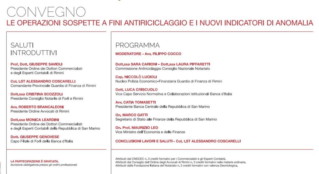 Venerdì 20 settembre al Centro Congressi SGR di Rimini dal titolo ‘Le operazioni sospette a fini antiricilaggio e i nuovi indicatori di anomali’