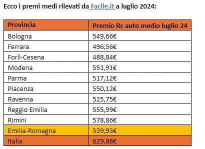 Analizzando i dati dell’Osservatorio di Facile.it emerge che, a luglio 2024, la provincia dell’Emilia-Romagna in cui l’RC auto costa è risultata essere più costosa è quella di Rimini, dove il premio medio è arrivato a 578,86euro. Seguono le province di Reggio Emilia (555,99euro), Modena (551,91 euro) e Piacenza (550,12 euro).