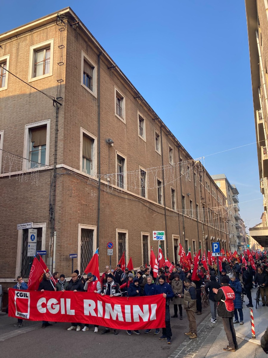 Oggi (venerdì 12 dicembre) si sciopera in tutta Italia a seguito della mobilitazione indetta dalla Cgil contro la finanziaria varata dal governo Meloni. Il sindacato chiede un aumento dei salari, fermare l'aumento dell'età pensionabile, dirottare le risorse per il riarmo su sanità e istruzione, nonché un'equa risorsa fiscale. Lo stop di oggi, di 24 ore, riguarda tutti i settori. E anche a Rimini la Cgil è scesa in piazza, con un corteo partito alle 9.30 dalla zona della stazione ferroviaria, con arrivo in via IV Novembre, davanti al palazzo della Prefettura. La Cgil, intorno a mezzogiorno, ha diffuso anche i primi dati sull'adesione: al 90% alla Ups di Cattolica, 90% alla Omcl di Rimini, al 60% alla Marinelli, al 50% alla Oliveri. La Filcams aggiunge: sciopero del 50% per Apt Servizi, stessa percentuale per Itx Zara e Camst, 40% per Blugas Srl.