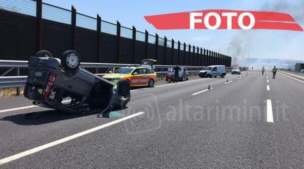 Incidente sull'A14 a Rimini tra tre auto, una si ribalta. Caos per il traffico