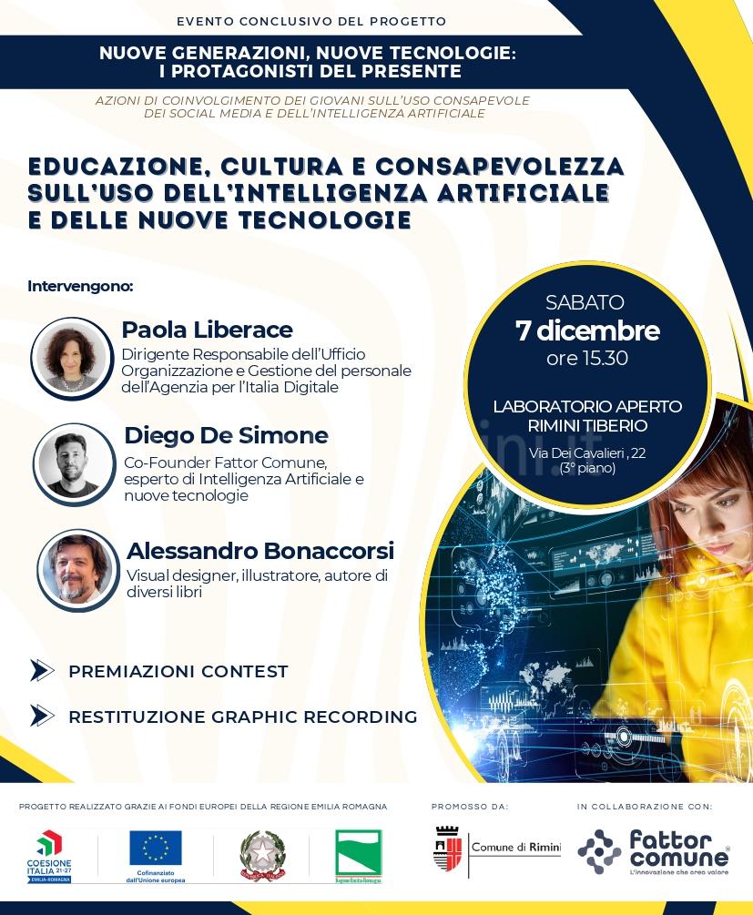 Sabato 7 dicembre, dalle ore 15.30 alle 17.00, al Laboratorio Aperto Rimini Tiberio si terrà l’appuntamento di chiusura del progetto ‘Nuove generazioni, nuove tecnologie: i protagonisti del presente’ promosso dal Comune di Rimini, in collaborazione con Fattor Comune e finanziato grazie a fondi europei della Regione Emilia-Romagna.