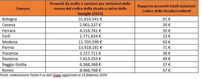 Analizzando il valorepro capite, calcolato come rapporto tra i proventi e il numero di abitanti residenti, ai primi posti si trovano ancora Bologna (81 euro), Parma (71 euro) e Modena (63 euro), seguite da Rimini (57 euro), Ravenna (49 euro) e – a brevissima distanza tra di loro – Reggio Emilia (37 euro), Piacenza (36 euro) e Ferrara (35 euro). Chiudono la classifica, ancora una volta, i comuni di Cesena (30 euro) e Forlì (15 euro).