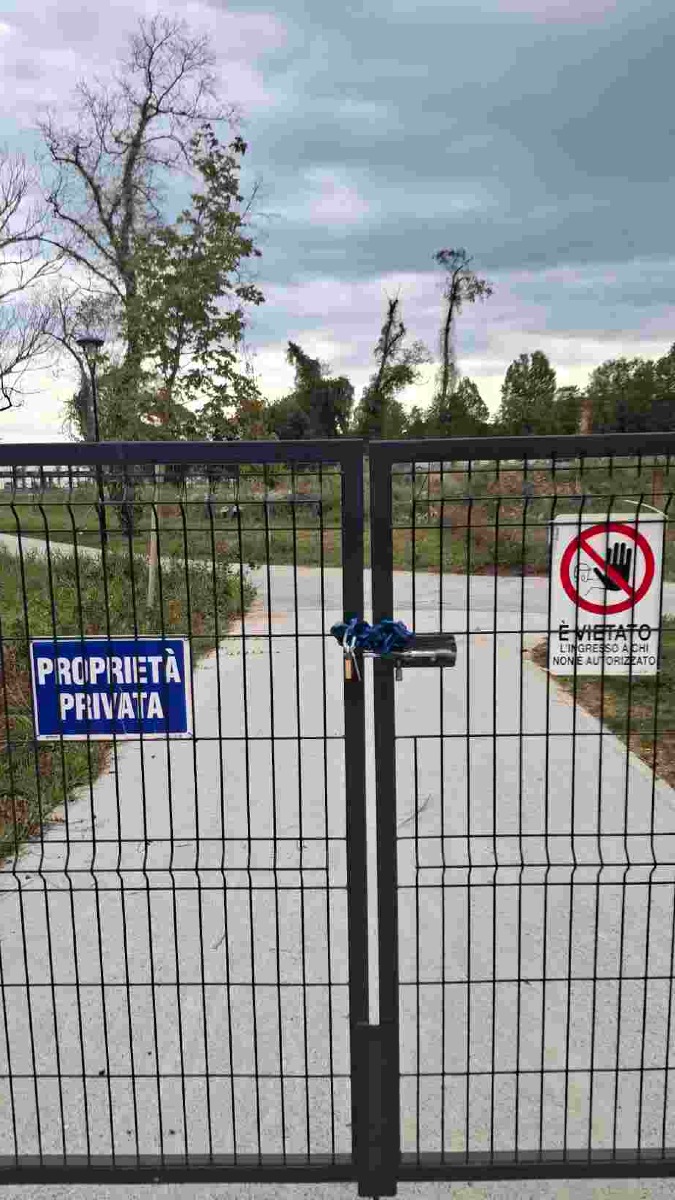 A destare maggiore sorpresa è la chiusura del parco, che, nonostante fosse stato presentato come pubblico, risulta oggi inaccessibile: i cancelli sono chiusi con catene e lucchetti e un cartello segnala “proprietà privata”. All’interno, campi da basket e volley inutilizzati e aree verdi lasciate al degrado.