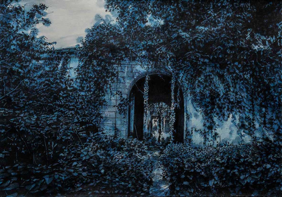Ne emergono atmosfere sospese e visioni interiori in cui il tempo sembra fermarsi: luoghi reinterpretati in scenari silenziosi ed enigmatici dove lo spazio diventa una dimensione contemplativa e interiore. Nell’atmosfera rarefatta e sospesa che Chiesi riesce a restituire allo sguardo di chi li osserva, le antiche architetture e gli ambienti naturali sembrano ricongiungersi al trionfo della natura, autentica ed assoluta protagonista dello spazio e del paesaggio. Disegno e pittura si fanno strumenti di ricerca spirituale che unisce la pratica artistica, la meditazione e lo studio delle filosofie orientali, elementi che da anni nutrono il linguaggio espressivo di Chiesi.