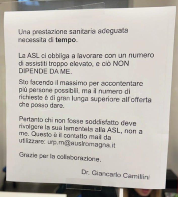 Medico riminese mette cartello dopo le proteste dei suoi assistiti: un carico di lavoro eccessivo. La protesta di Giancarlo Camillini ha fatto parlare sui social