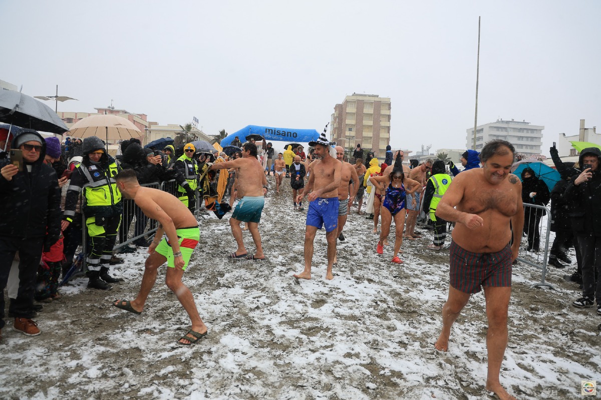 La neve non ha fermato i temerari che questa mattina (martedì 6 gennaio) si sono ritrovati nelle acque di Misano Adriatico, davanti a Piazzale Roma, per il Tuffo della Befana.