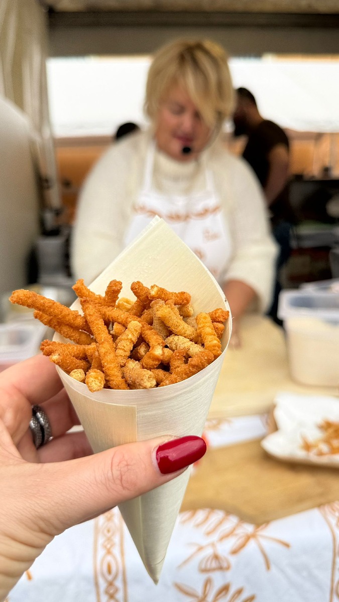 Alla Fiera di San Martino di Santarcangelo, quest’anno non si è parlato solo di bomboloni e salsiccia e cipolla: anche i passatelli fritti di Frida Vasini, allo stand del Boomerang, hanno letteralmente conquistato il pubblico. Dietro al successo, l’energia contagiosa di Frida Vasini, la food creator romagnola con più 10 mila follower. Il pubblico di San Martino ha risposto con entusiasmo, trasformando lo stand del Boomerang in una tappa obbligata del percorso gastronomico della fiera: oltre 500 uova utilizzate, centinaia di coni serviti e una fila costante di curiosi, buongustai e fan dell’Azdòra.