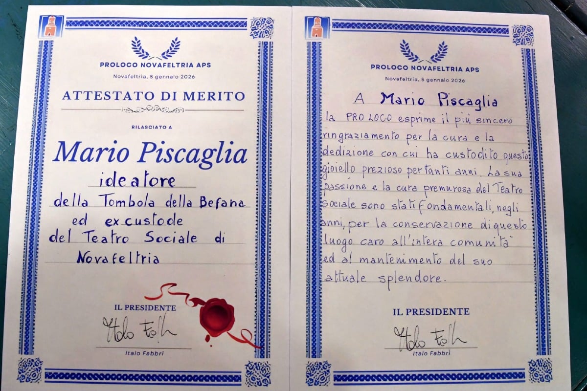Per l'occasione, infine, sono stati anche preparati tre attestati di merito. Il riconoscimento a Mario Piscaglia, ex custode del teatro sociale di Novafeltria, a Mario Santi, ex presidente della Pro Loco, e a Vanna Reali, "notaio" di fiducia della tombola a tutte le edizioni. Piscaglia e Santi sono stati, rispettivamente, ideatore e organizzatore della prima edizione dell'evento. La Pro Loco ha espresso soddisfazione per la riuscita dell'evento: "La Tombola della Befana è ormai un appuntamento fisso nella tradizione di Novafeltria e la comunità si stringe attorno a questo evento che unisce grandi e piccini".