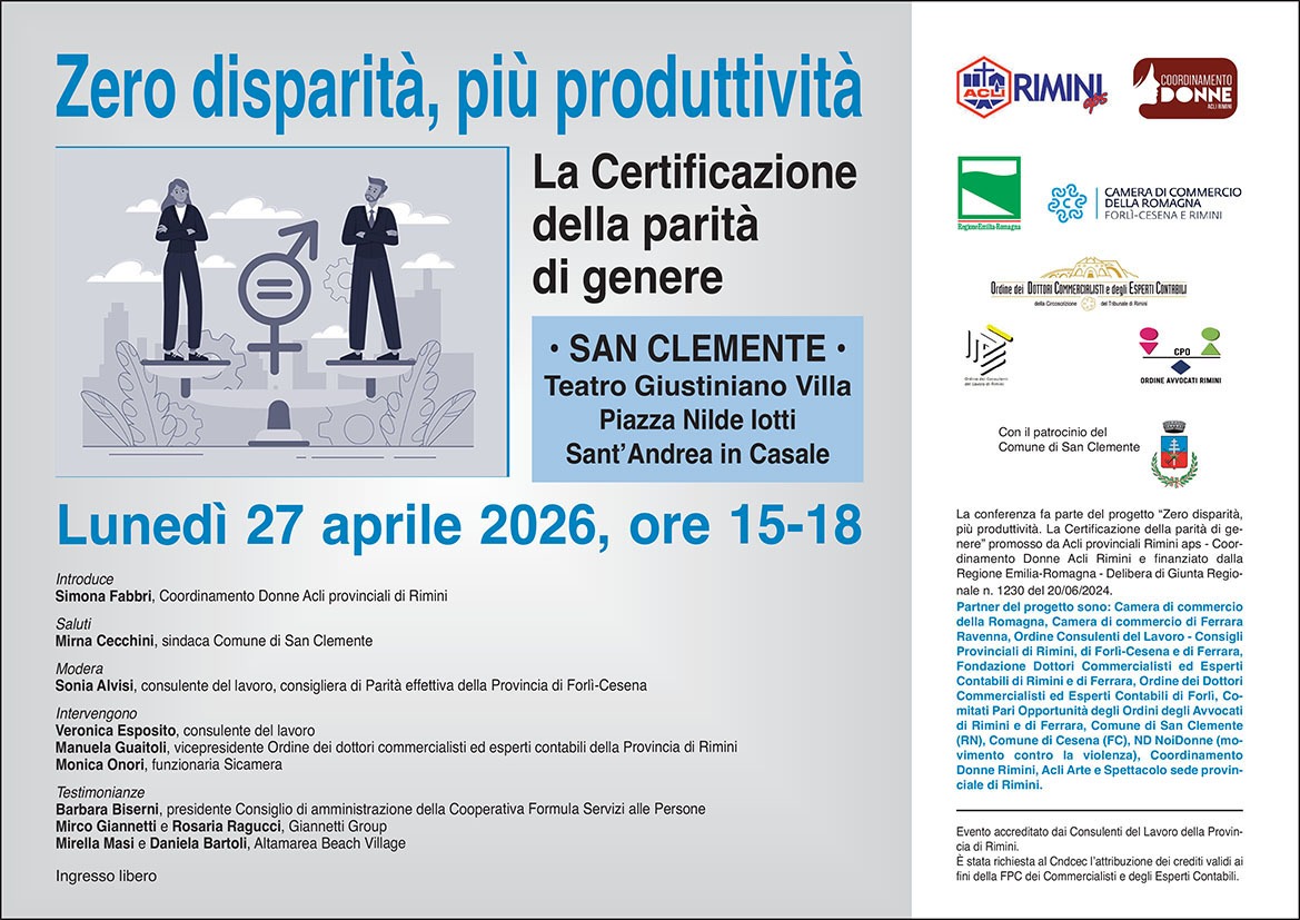 Il progetto “Zero disparità, più produttività. La Certificazione della parità di genere” è promosso dalle Acli provinciali di Rimini – Coordinamento Donne Acli Rimini (capofila) e da un’ampia rete di partner: Camera di commercio della Romagna, Camera di commercio di Ferrara-Ravenna, Ordine consulenti del lavoro - Consigli Provinciali di Rimini, di Forlì-Cesena e di Ferrara, Fondazione Dottori Commercialisti ed Esperti Contabili di Rimini e di Ferrara, Ordine dei Dottori Commercialisti ed Esperti Contabili di Forlì, Comitato pari opportunità dell’Ordine degli Avvocati di Rimini e di Ferrara, Comune di San Clemente (RN), Comune di Cesena (FC), ND NoiDonne (movimento contro la violenza), Coordinamento Donne Rimini, Acli Arte e Spettacolo sede Provinciale di Rimini.