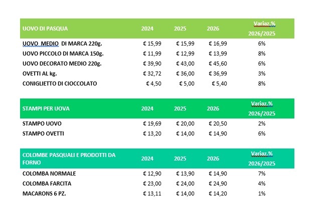 Dopo la forte impennata del costo del cacao, si registrano, anche quest’anno, aumenti nel settore delle uova di Pasqua (mediamente +6%), con in testa i coniglietti di cioccolato e l’uovo piccolo (+8%). Nel settore dei prodotti da forno ad aumentare maggiormente è il prezzo della colomba classica (+7%), in quello della carne il prezzo di agnello e coniglio (+10%). Le uova fresche aumentano (nella confezione da 10 pezzi) del +8%.