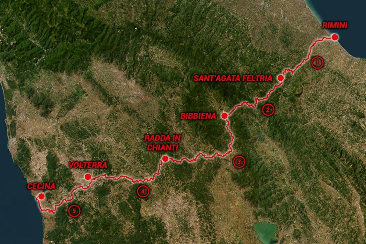 Da lì si prosegue verso Novafeltria, poi Sant’Agata Feltria, attraversando borghi e vallate come Bibbiena, Radda in Chianti e Volterra, fino a raggiungere la costa tirrenica.