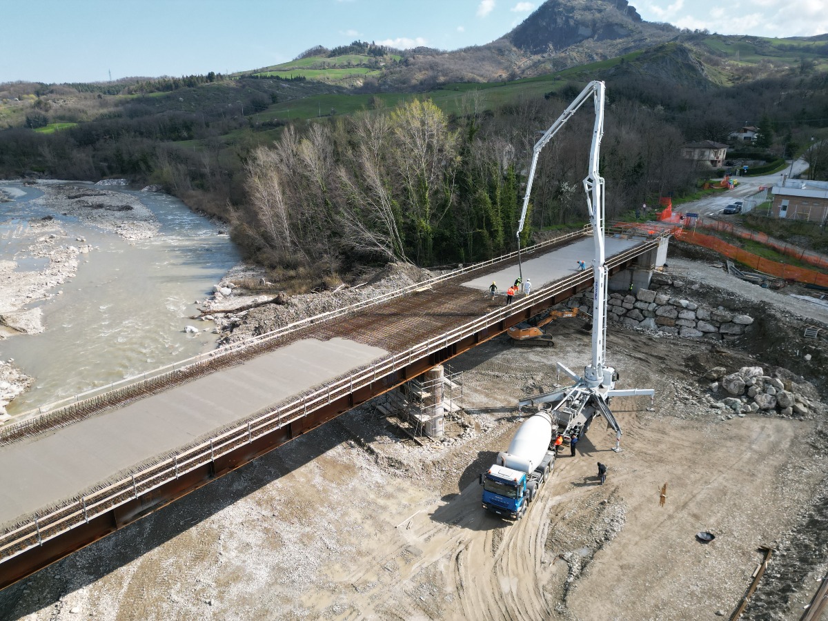 Attualmente sono in corso le lavorazioni per il completamento dell’impalcato, con la realizzazione della soletta in calcestruzzo, che costituirà il piano su cui verrà poi realizzata la carreggiata stradale.